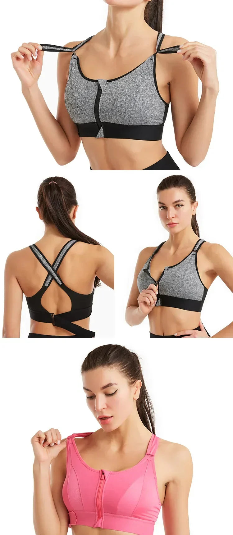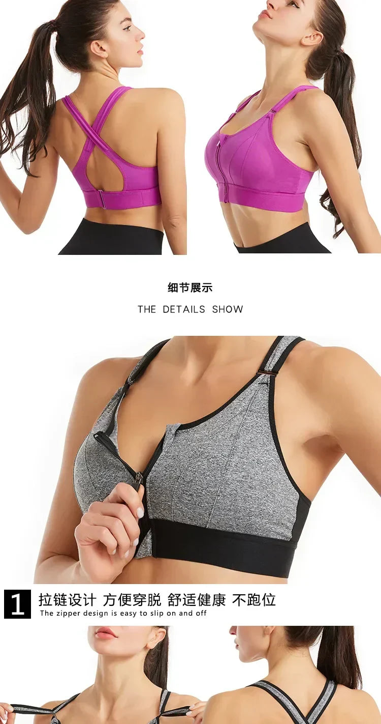 Women Sports Bras Tights Crop Top Yoga Vest Front Zipper Plus Size Adjustable Strap Shockproof Gym Fitness Athletic Brassiere